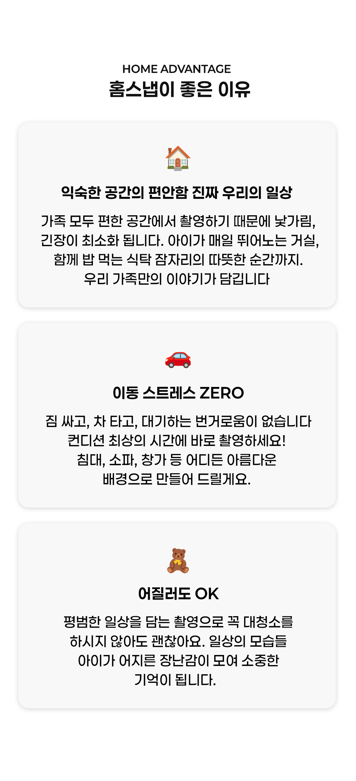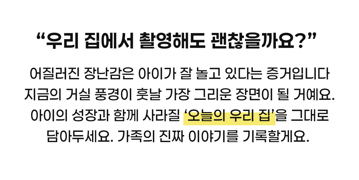 우리집에서 남기는 '우리 가족만의 순간' 아이가 꺼내어 볼 수 있는 추억을 만들어 주세요. 집에서 찍어도 화보처럼 남겨드릴게요